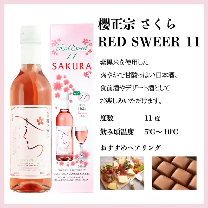 (紅)「さくら RED SWEET11」: 紫黒米使用、甘口、アルコール度数11% よく冷やすと美味しい