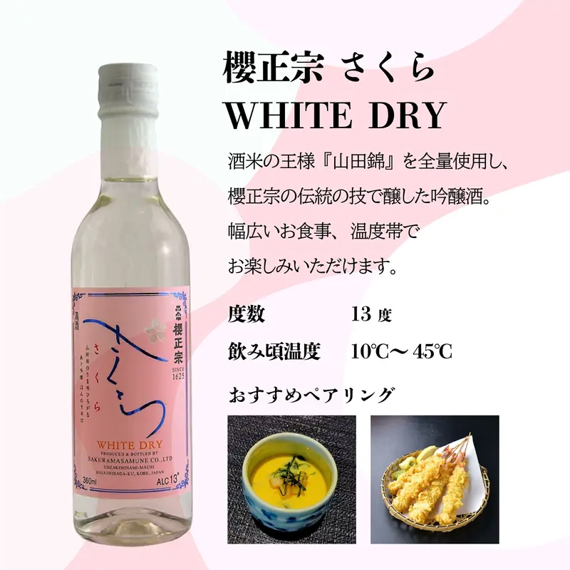 (白)「さくら WHITE DRY」:吟醸酒、淡麗やや辛口、アルコール度数13%、冷酒でも燗酒でもOK